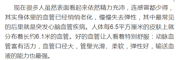 很多人以为,只有到老了的时候,才为我们的血管操心。殊不知,血管斑块变大,从30岁以后就加速了,再加上现代人活得越来越累、吃得越来越不健康、运动得越来越少,不知不觉中加速了血管的衰老和损坏。