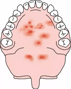 ② 发热1-2天后,在舌头、牙龈或两颊内侧等口腔部位出现水疱,痛感明显,但口腔里的水疱很快破溃而形成灰白色的小点或灰白色的一层膜,其周围有红晕,在灰白色的膜下可以见到点状或片状的糜烂面。