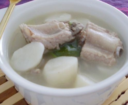 4、放入山药,再开大火,汤烧开后,,加盐,再用小火炖半小时至排骨酥烂。