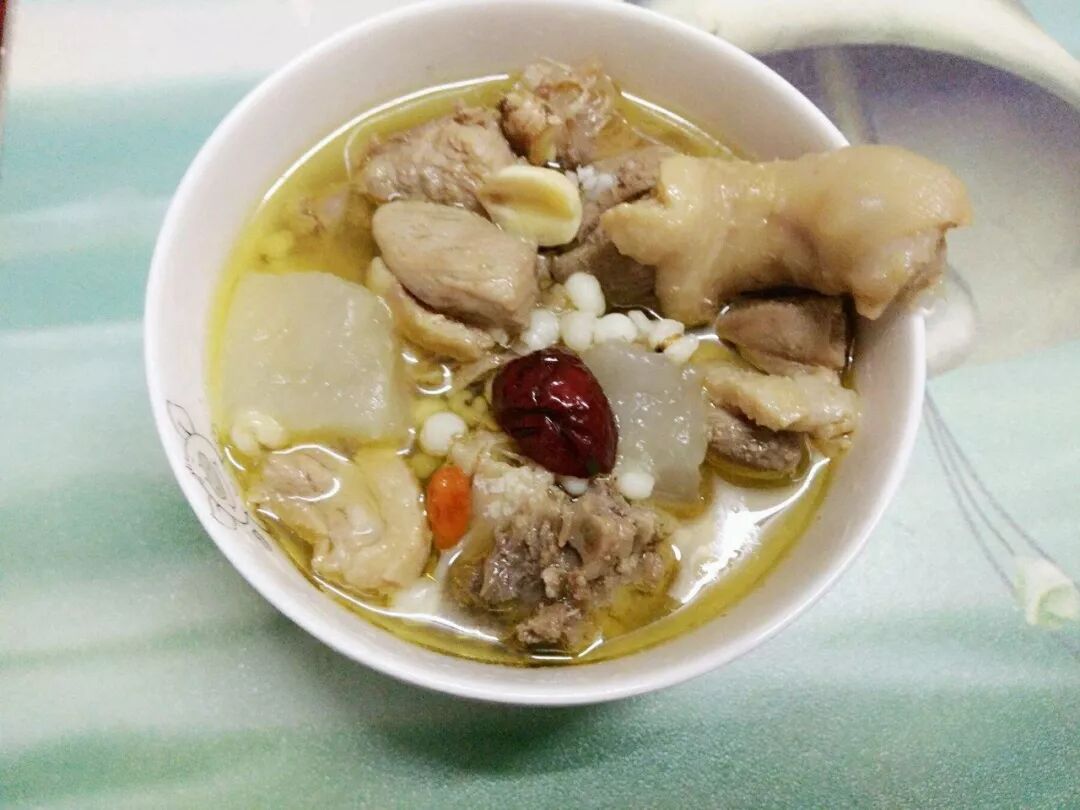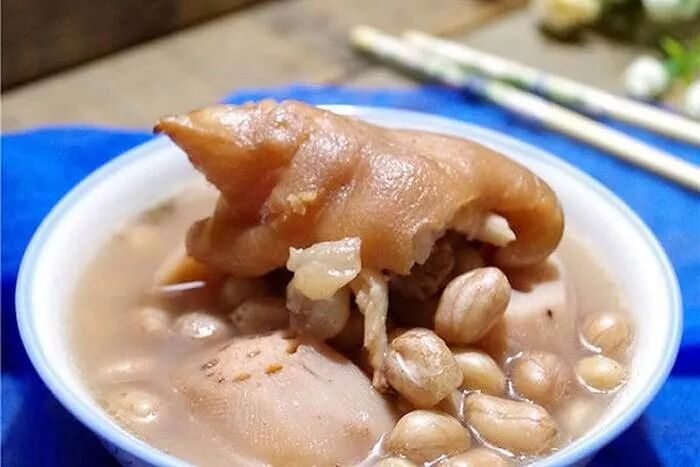 做法:猪脚切块,放入沸水中汆烫出血水,捞出后泡入冷水中。花生先浸泡4小时,放入锅内煮到略软。将猪脚、黄芪、红枣和花生同时放入炖锅中,加入水盖过所有材料。炖煮到花生和猪脚熟烂,加入当归焖煮五分钟即可。