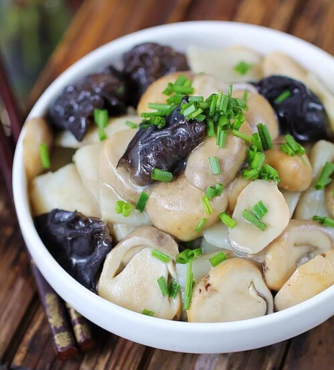 食材:草菇300g,山药300g,黑木耳100g,食盐、葱、植物油、生粉适量。