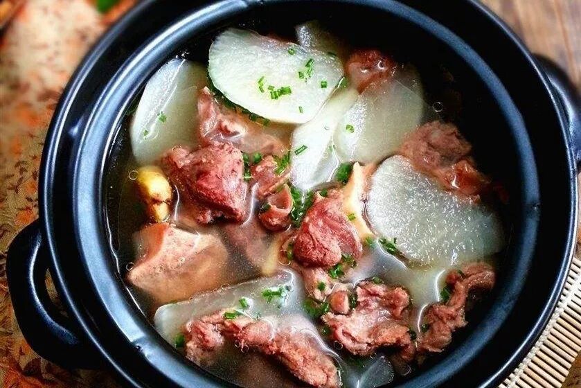 食材:羊肉500g,白萝卜300g,山楂20g,姜、盐适量。