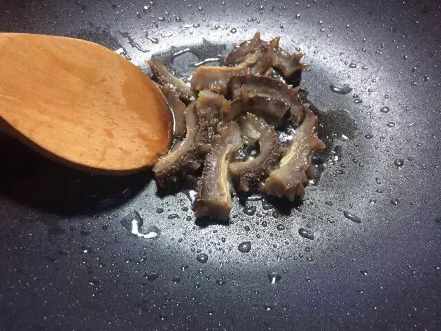 3、 炒锅倒适量油烧热,放葱姜炒香,然后倒入海参,加耗油煸炒2分钟;