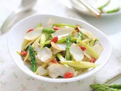 【材料】芦笋1小把,鲜百合2个,枸杞3-5颗,淀粉1小勺,植物油,盐。