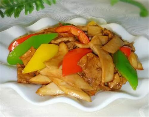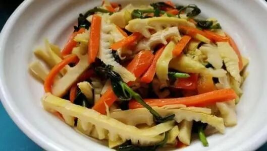 【材料】春笋150g,胡萝卜80g,植物油、盐、姜适量。
