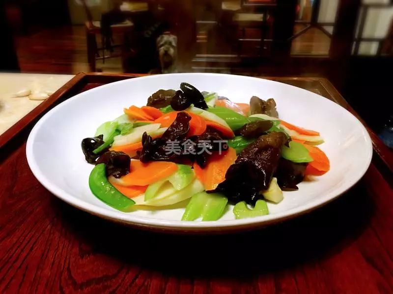 荷兰豆30g,山药40g,胡萝卜40g,西芹30g,黑木耳10朵,味全高鲜2g,盐3g,橄榄油15ml,姜2片