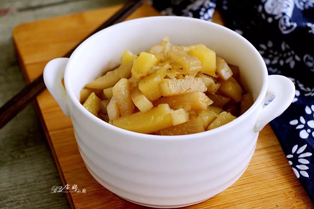 3、白萝卜切比土豆细点的条,这样才能熟到一起去,