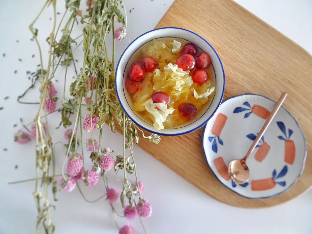 水发银耳100克,樱桃去核30克,糖桂花适量,冰糖适量