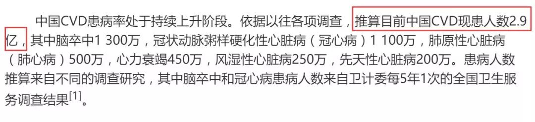 根据 2017 年《中国心血管病报告》的数据显示,我国现有 2.9 亿人患心血管病,心血管的死亡占居民疾病死亡构成 40% 以上,比肿瘤和其他疾病都要高。