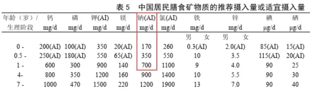 0~6 个月的宝宝钠适宜摄入量是每日 170 mg;
