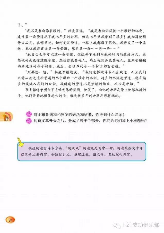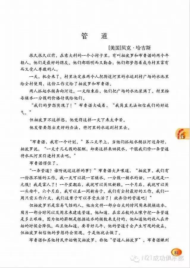 这个故事已经被编入小学五年语文教科书中,81-84页《管道》教育孩子们从小就要在头脑中拥有管道的思维方式,而不是水桶思维,以便将来能够建立属于自己的财富管道,成为财富的拥有者,正如贝克·哈吉斯所说,一条管道胜过一千张工资单!