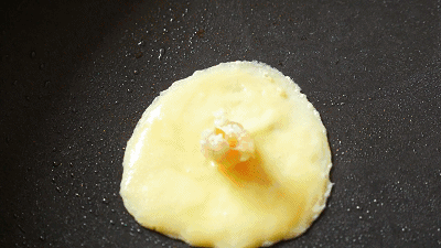 tips:取馅料的时候一定要根据摊的蛋皮来决定哦,最好是少量,要不然不好做出小鱼的形状,而且还会把蛋皮撑破~