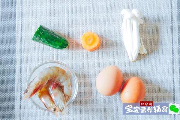 食材:虾3只、胡萝卜20克、白玉菇20克、鸡蛋2个、黄瓜25克