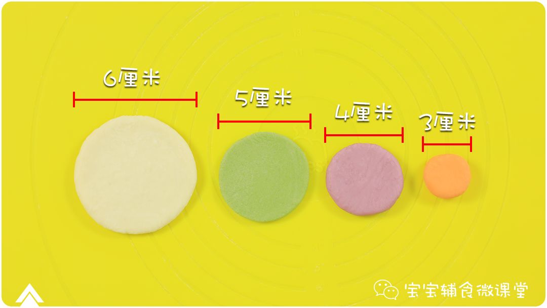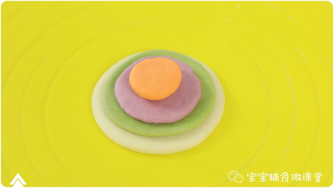 再把白色面团擀成直径6厘米的面片,绿色面团擀成直径5厘米的面片,紫色面团擀成直径4厘米的面片,橙色面团擀成直径3厘米的面片。