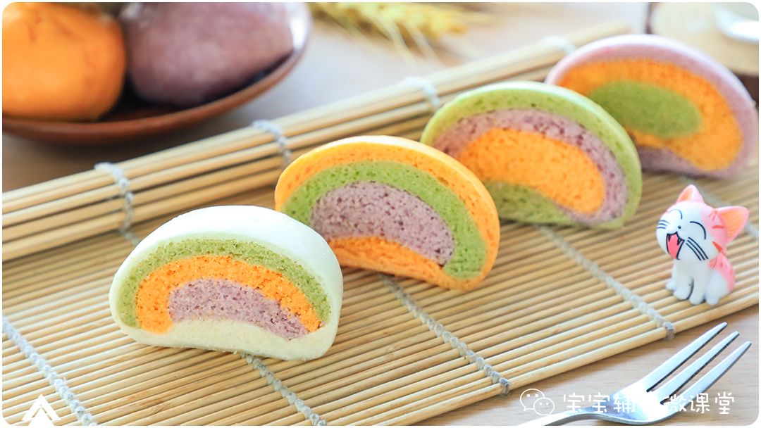 松软的彩虹馒头出锅啦~对半切开后,犹如一道弯弯的彩虹,是不是很漂亮呢?口感特别松软易咀嚼,还带有一丝蔬菜的甜味。宝宝们肯定已经等不及了,舔着舌头就想吃啦~