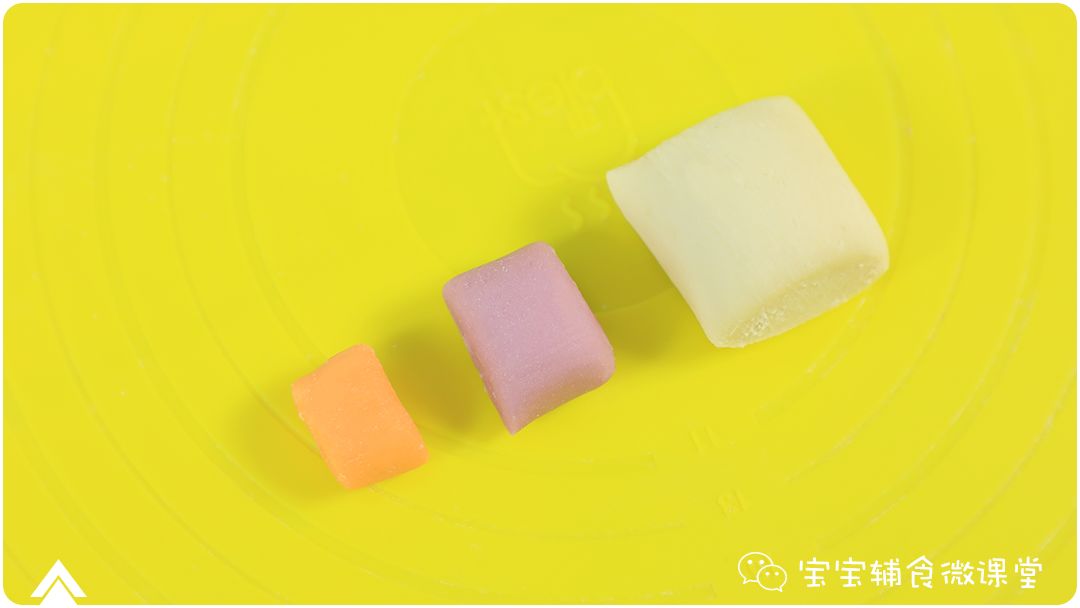 用同样的方法把白色的面团切成15克1个的小剂子,紫色面团切成6克一个的小剂子,橙色面团切成3克1个的小剂子。