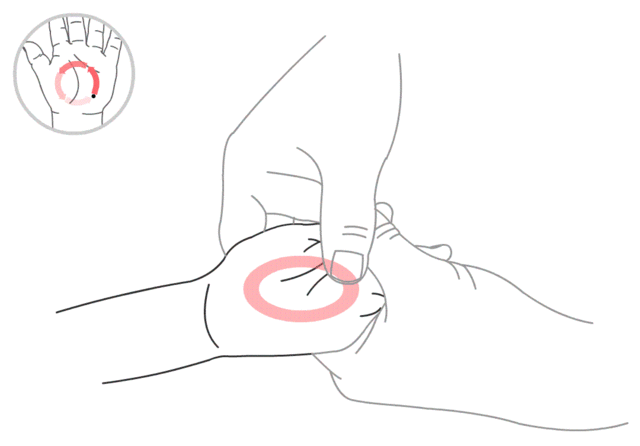 手法:操作时,左手握住小儿的手指,用右手拇指按摩小儿掌心50~100次,按揉时,顺、逆时针皆可。