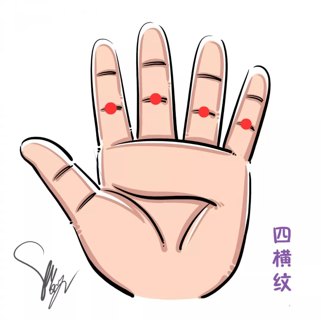 四横纹位于掌面,食、中、无名、小指第一指间横纹。用拇指逐个掐揉,掐一揉三,操作1~2分钟。