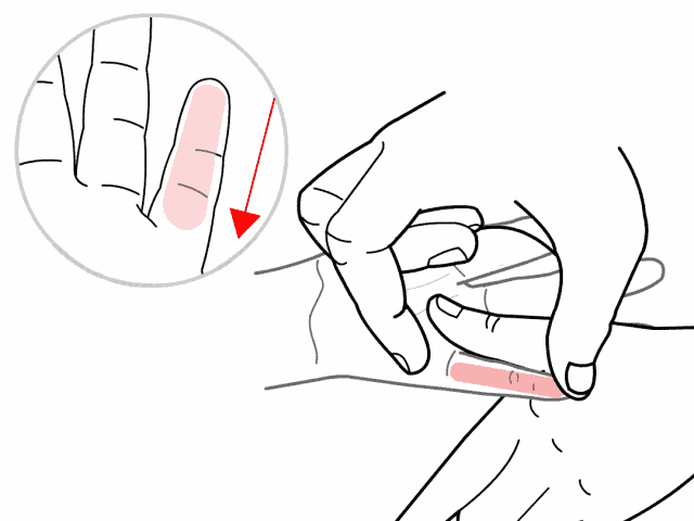 手法:位于拇指桡侧缘(外侧),赤白肉际处,顺着拇指桡侧从拇指指尖推至指根,500次,有缓解孩子遗尿的作用。