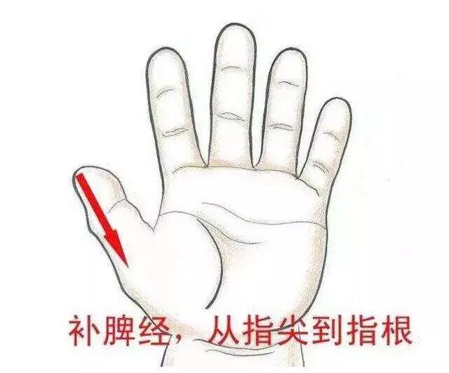 手法:在拇指桡侧由指尖直推向指根方向为补脾经,用右手拇指的桡侧向心方向推拿,300~500次。