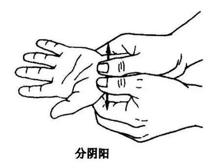 手法:在手掌根部,向两旁分至阳池、阴池。用双手大拇指,向两侧分推,推100-150次。