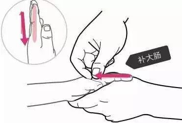 手法:大肠经在食指的桡侧缘,指尖到指根的连线上。从小儿食指尖沿其食指桡侧向食指根直线推动约200次。