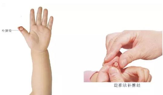 操作:家长以一手持小儿拇指以固定,另一手以拇指螺纹面旋推小儿拇指螺纹面300次。