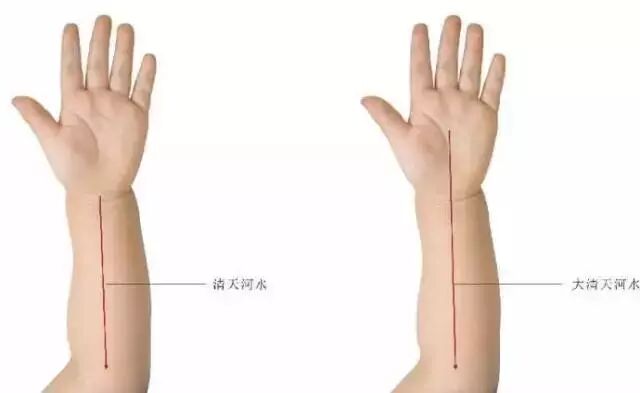 位置:宝宝前臂内侧正中,自腕横纹至肘横纹成一直线,称为天河水。
