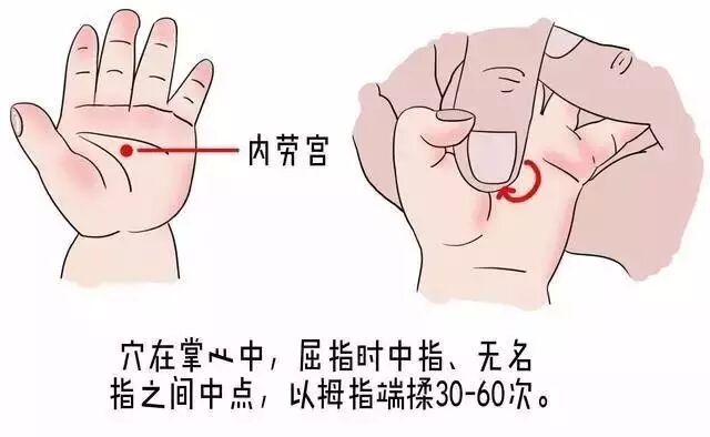 位置:在手掌心,当第2、3掌骨之间偏于第3掌骨,握拳屈指时中指尖、无名指尖之间中点处;