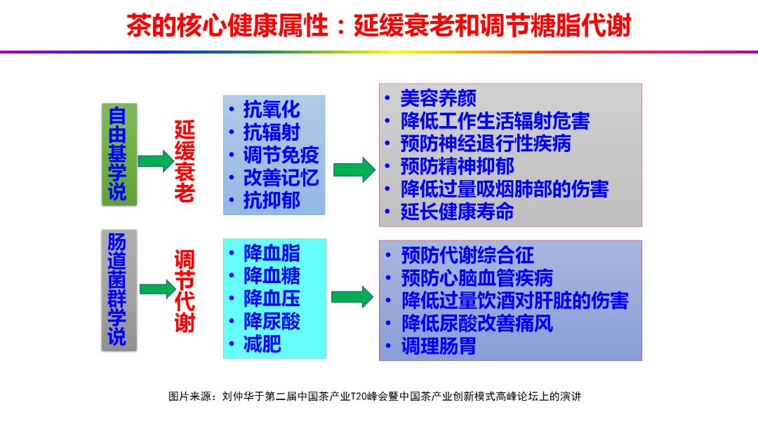 随着科学的进步,根据自由基学说与肠道菌群学说确认了茶的核心健康属性为延缓衰老和调节糖脂代谢。