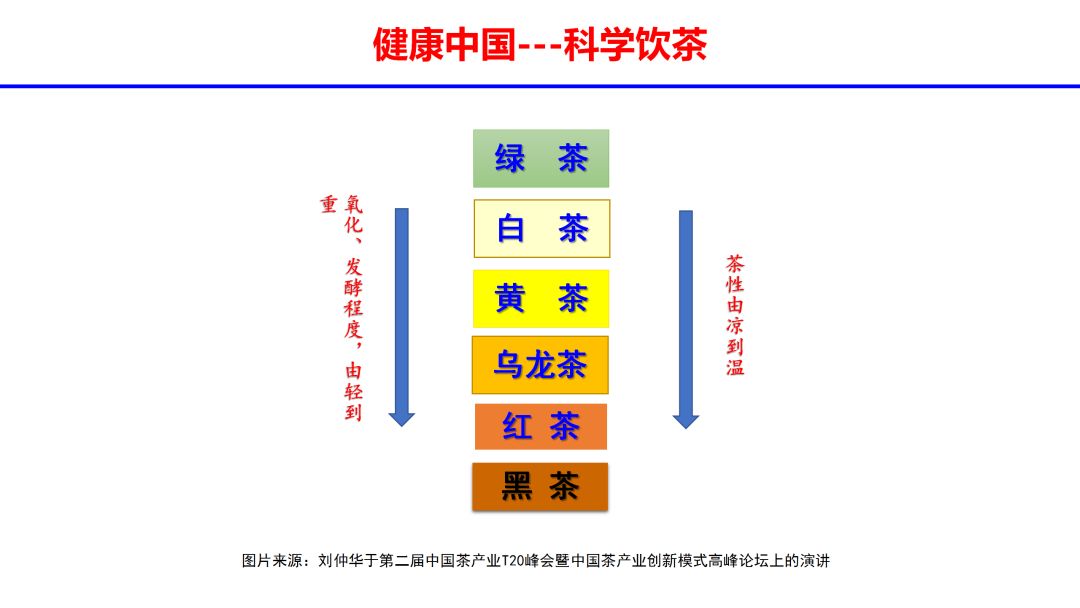 基于茶的延缓衰老和调节糖脂代谢两大属性,刘仲华院士提出科学健康饮茶的方法——六大茶类,健康属性各有所不同,建议交替喝。