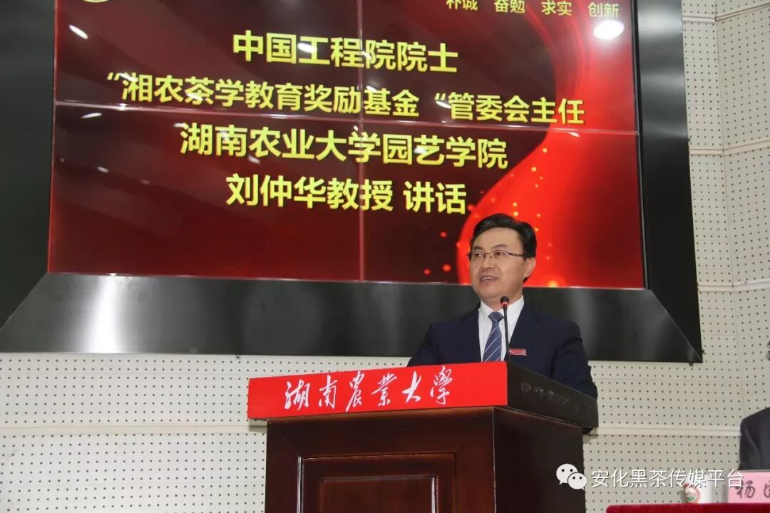 中国工程院院士、湖南农业大学教授刘仲华在讲话中表示:“感谢我们伟大的时代,让我们所有有梦想的人,只要坚持、只要努力就能够成功。”刘仲华现场分享了38年来的科研之路,他认为大学生要学会坚持、勤奋、协作和奉献。他说:“在知识爆炸的年代,吃苦耐劳的精神和创新精神是我们团队成功的先决条件。感谢我们有一个很好的学科和产业,感谢我们有一个有着吃苦耐劳精神和创新精神的团队,希望同学们为中国茶产业发展贡献自己的一份力量。”