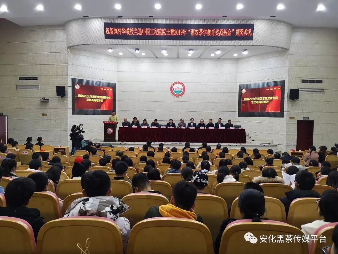 1月3日,湖南农业大学园艺学院举行祝贺刘仲华教授当选中国工程院院士暨2019年“湘农茶学教育奖励基金”颁奖典礼。湖南农业大学副校长邹冬生,中国工程院院士、湖南农业大学教授刘仲华,湖南农业大学园艺学院院长杨国顺,湖南省茶业集团股份有限公司董事长周重旺等“湘农茶学教育奖励基金”管理委员会负责人以及园艺学院师生参加了颁奖典礼。