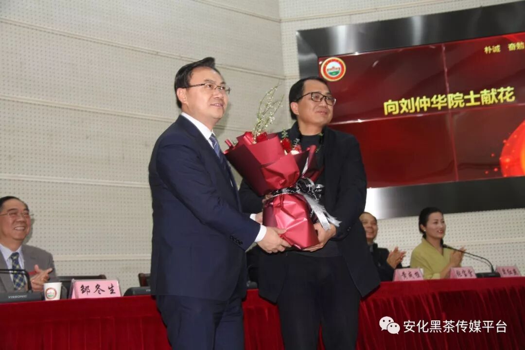 刘仲华院士的学生、湖南农业大学茶学系主任肖文军教授上台为刘仲华院士献上鲜花,师生情谊让现场响起了长时间的热烈掌声。