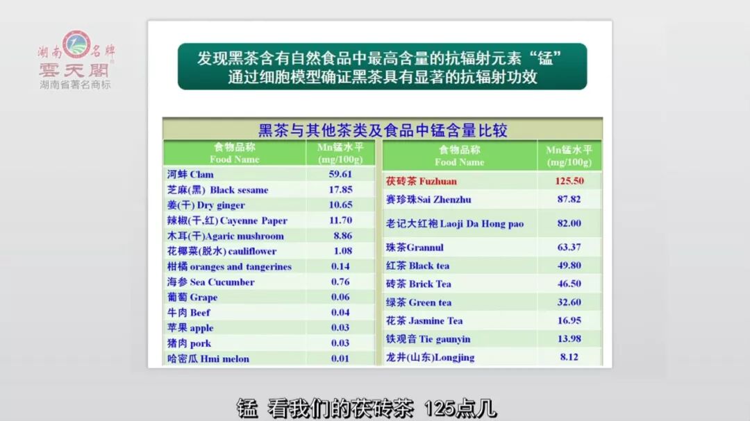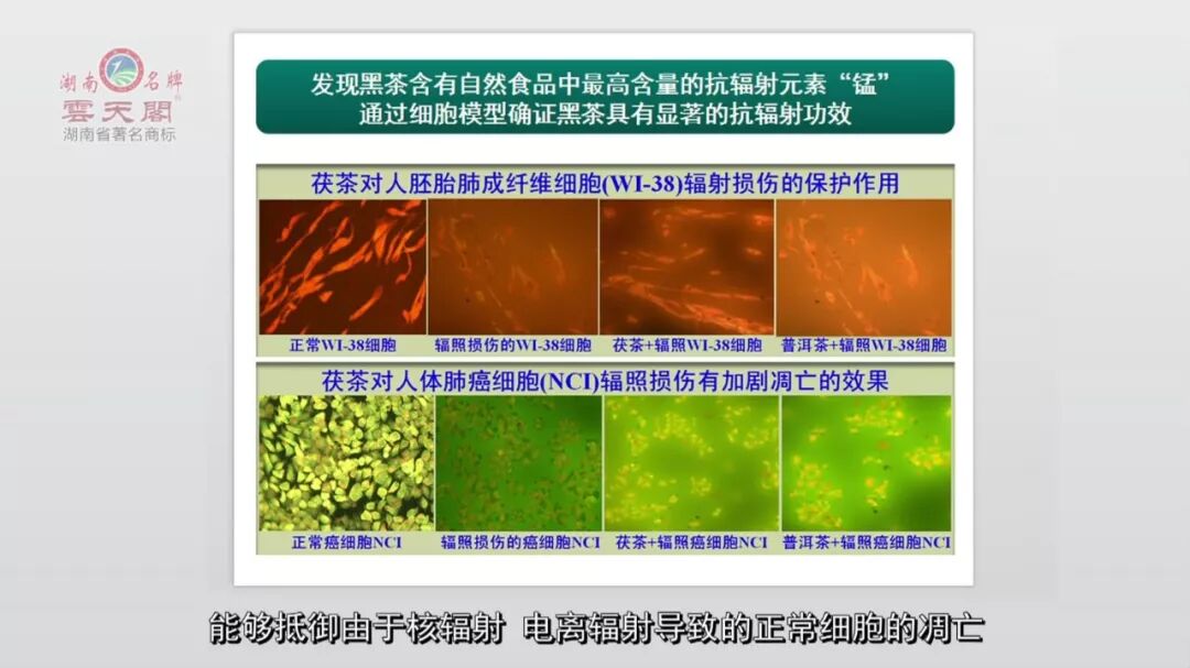 黑茶是我国食品中锰含量最高者之一。锰是人类抗辐射、抗衰老功能必需的有效元素,锰在茯砖茶里含125mg/100g,哈密瓜、猪肉、苹果、牛肉、葡萄等只有0.01,哪怕是大宗食物中最高的黑芝麻、干姜、辣椒和河蚌等也只有10到50多,而茶叶中随便哪一个茶都有8~100,而安化黑茶达100多,是其他食物的几百倍甚至上千倍。所以,黑茶的抗辐射能力是非常强的,与其高锰的元素组成特征是有关系的。我们通过细胞学的实验发现,安化黑茶能够加速癌细胞的凋亡,能够抵御由于核辐射、电离辐射导致的正常细胞的凋亡。换句话讲,保护正常细胞抵御放疗带来的伤害,能够加速放疗对癌细胞的凋亡,从而达到有效提升放疗效果的作用。癌症病人如果能够坚持喝安化黑茶,顺利的完成放疗过程,头发可能没掉那么多,皮肤依然保持得比较好,消化系统与代谢功能受损伤的程度就会小一些。