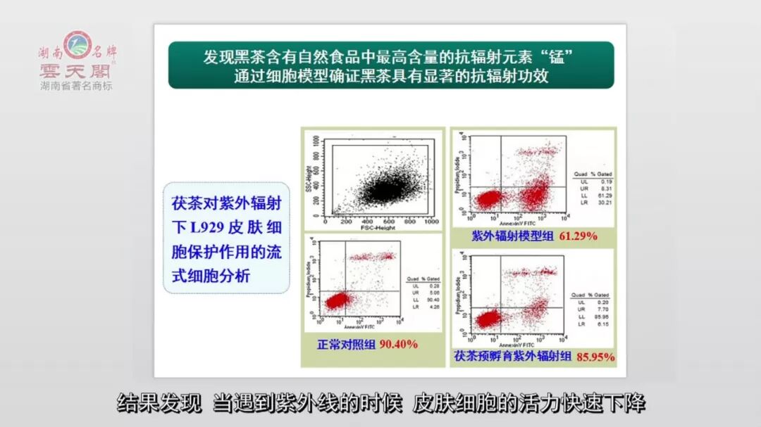 我们用紫外辐射来研究黑茶的抗辐射功效,看看紫外线对皮肤细胞的伤害。结果发现,当遇到紫外线的时候,皮肤细胞的活力快速下降,当有安化黑茶一同培养的时候,皮肤细胞的活力,增殖能力快速恢复,接近正常细胞水平,这是运用流式细胞技术研究细胞的生命周期,来观察黑茶对皮肤细胞抵御辐射的效果,这台设备就是150万人民币。我们研究发现,安化黑茶能够抵御外界紫外线辐射对皮肤细胞带来的伤害。