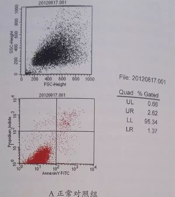永生化角质形成细胞(HaCaT)受辐射处理后经流式凋亡检测发现(如下图),正常组的正常细胞(左下象)占95.34%,辐射模型组占72.48%,千两茶水提物预处理的辐射组占83.36%。由此可见,紫外辐射对HaCaT细胞的损伤较重,而经过20ug/mL千两茶水提物预处理后的细胞则可以有效地抵抗紫外辐射损伤。
