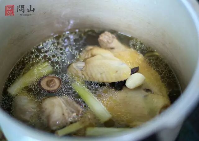 开盖,挑破看鸡肉的颜色及汤色。如果油腻较多、汤色还很清亮,加另一个茶包。