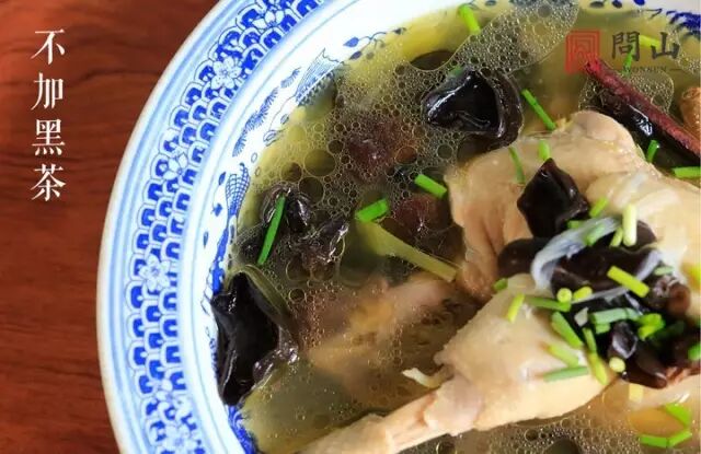 黑茶实验,选用黑茶中的代表安化黑茶茯砖茶,采用对比方式,即将整只鸡一分为二,一半放黑茶,一半不放。其余配料均相同,炖煮时间也相同。