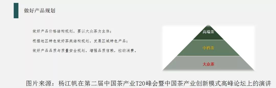 杨江帆教授认为,茶叶产品结构规划应是“宝塔型”的,“塔尖”部分发展高端茶,“基座”部分发展大众茶。好茶的价格一定是高昂的,但目前市面上并非所有高端茶皆为好茶,且高端茶的受众所占消费比例不高。茶企若只看重高端茶品类,则会造成高端茶的市场过剩。