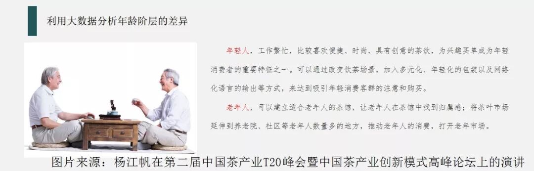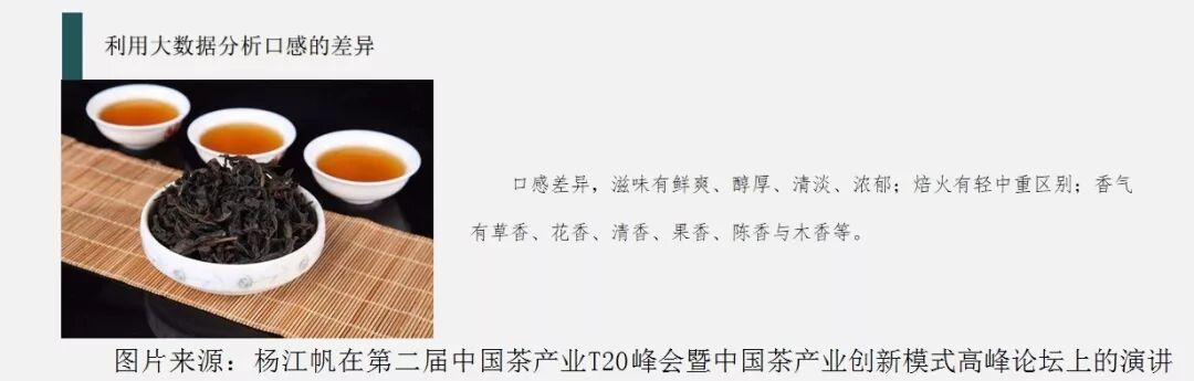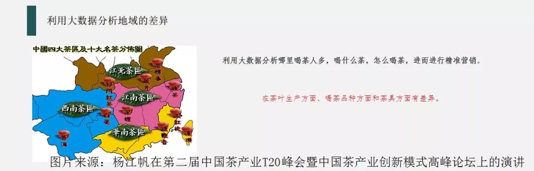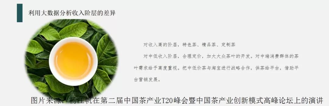 可以利用大数据分析地域差异、口感差异、年龄阶层差异、收入阶层的差异等,针对性地迎合不同人群所偏好的茶叶口味、香气及所能接受的产品价格等角度进行营销。