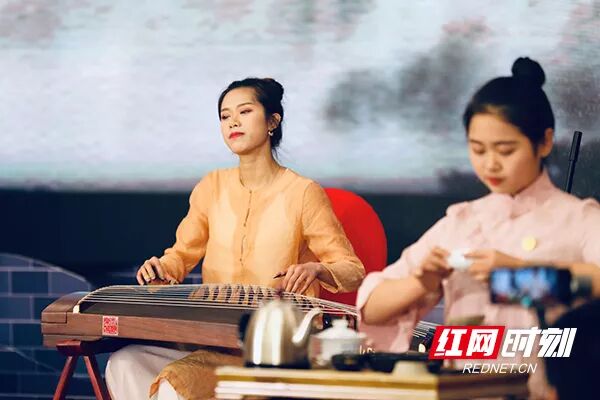 古筝悠扬,茶艺师身着秀美茶服,带来了精彩动人的茯砖茶茶艺表演。