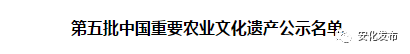 2019年12月31日,农业农村部农村社会事业促进司公示拟认定的第五批中国重要农业文化遗产名单,公示期七天,自2019年12月31日至2020年1月6日。