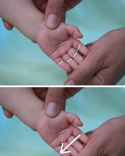 [操作]小儿四指拼拢,从食指横纹推向小指横纹,为推四横纹。用拇指甲掐,为掐四横纹。