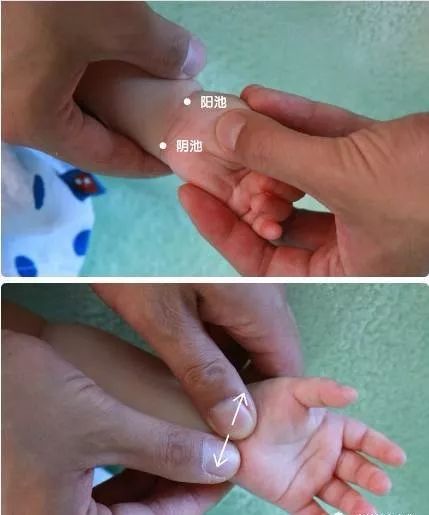 [位置]掌侧腕横纹。又称大横纹。桡侧(拇指侧)为阳池,尺侧(小指侧)为阴池。