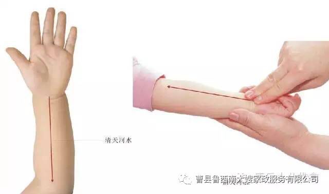 操作:用食、中指指腹,从腕横纹推至肘横纹,为清天河水。