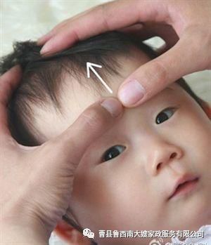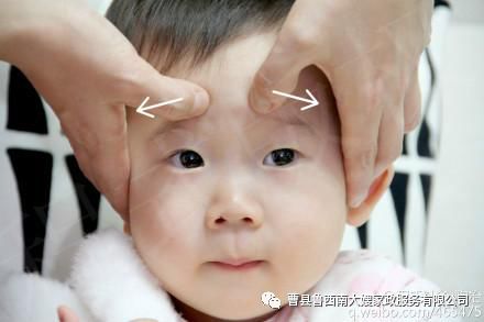 操作:用两手拇指指腹自两眉头之间向上交替直推至额上前发际处,为开天门。