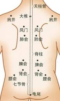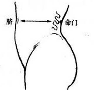 穴位:在腰后正中线上,第二腰椎棘突下凹陷中,与肚脐的神阙穴前后相对。取穴时可将双手食指相交在肚脐上,然后一左一右从肚脐出发,往腰后水平绕去,两手食指交汇处就是命门(也可以用卷尺哈)。