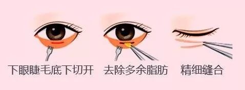 当然也有不留痕迹的“内进路方法”:从球结膜进路,用内切口方法,将眼袋的脂肪取出,结膜切口无需缝合。