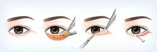 而多种手术方法中,最常用的就是“外进路方法”:沿着下眼睑的睫毛下做一个切口,把里面的脂肪拿掉,然后把多余的皮肤切除,眼袋的“袋”就消失了。